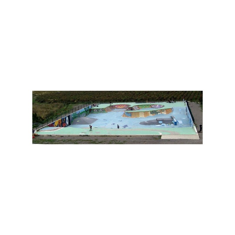 Skatepark en béton assez grand avec une partie bowl ouvert et une partie street. On retrouve 2 pyramides : une assez haute simple, et une plus petite avec courbes et ledge. Il y a beaucoup de quarters de différentes hauteurs, plans inclinés. La partie bowl est assez grande aussi au point de ne pas le rider comme on le devrait... Aire de flat tout autour.