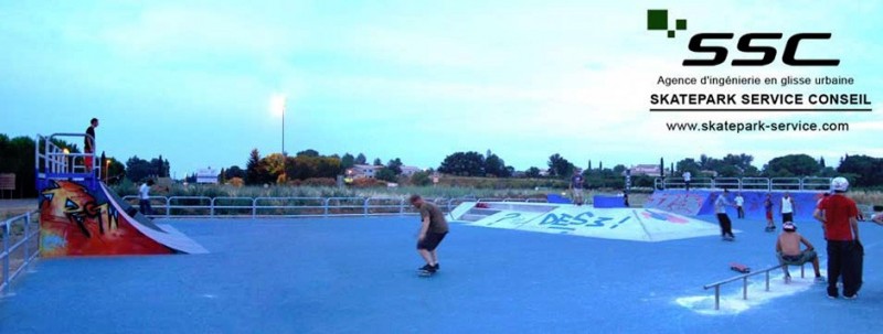Skatepark en béton et métal d'une superficie de 700m². On retrouve des quarters et plans inclinés pour prendre de la vitesse, une grosse funbox au milieu avec pyramide, marche, rail... et une flat barre.