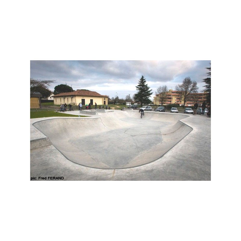 Skatepark en béton constitué principalement d'un bowl ouvert sur la partie street, il n'est pas très haut et il a un hip et une partie légèrement plus...