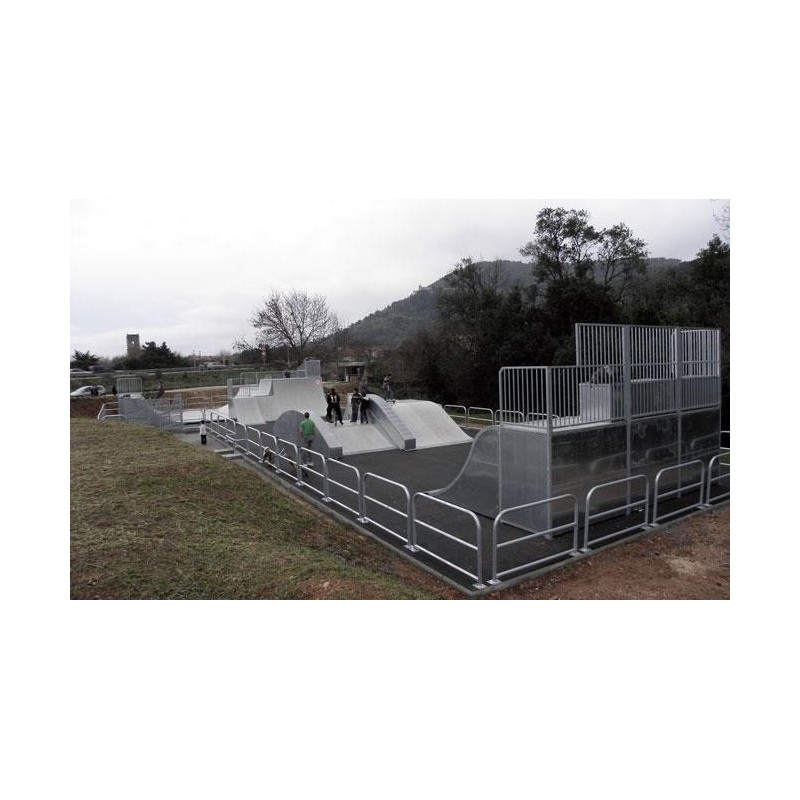 Skatepark modulaire en aluminium posé sur du bitume composé d'un half-pipe avec un quarter qui envoi sur une funbox composée de 2 tables. Il y a également une mini-rampe avec une partie plus haute.